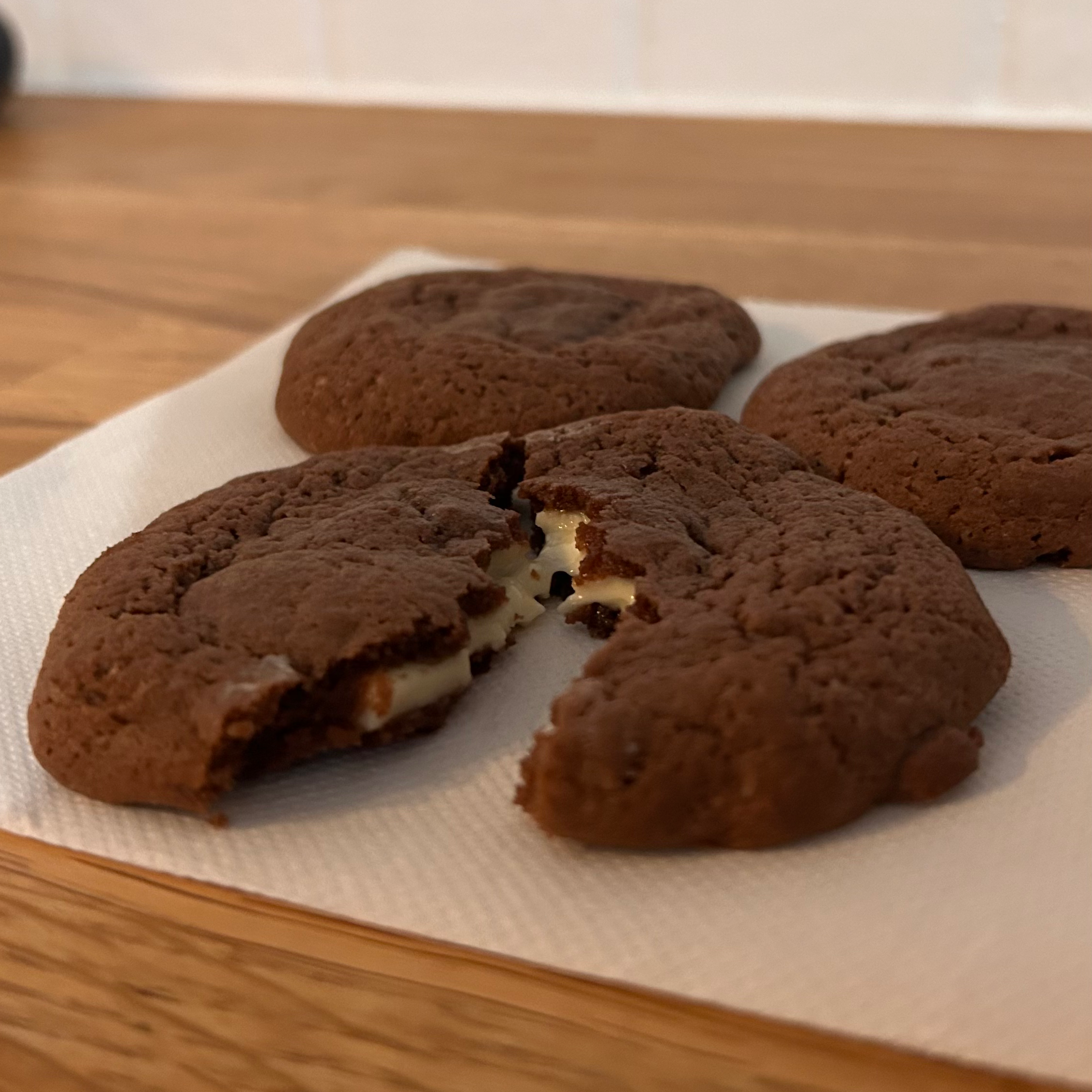 Recette de cookies gourmands au chocolat avec un cœur fondant au chocolat blanc.