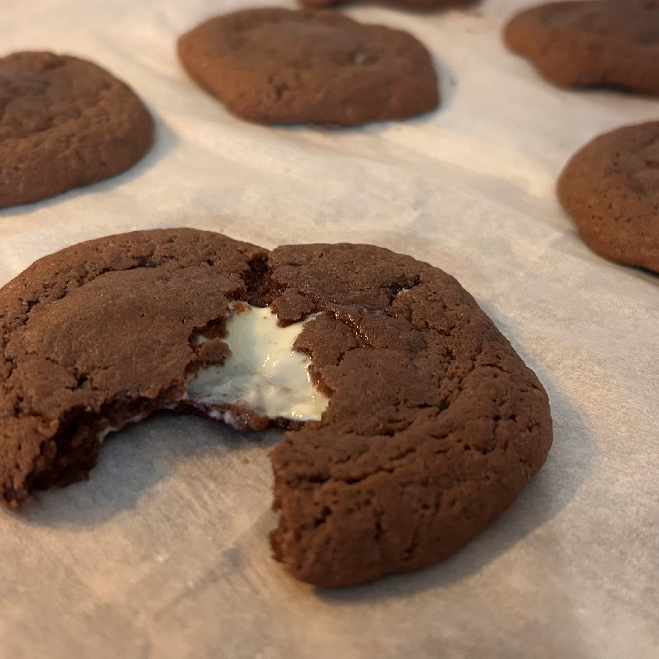 Formez des boules (35~40g), insérez un carré de chocolat blanc au centre et refermez bien. Placez vos cookies sur une plaque recouverte de papier sulfurisé.